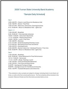 In order for students to receive the full academic benefits of the Academy, they must remain on the campus for the entire one-week session. We believe strongly that completion of the whole program is a primary objective of attendance. While activities such as athletics, recitals, and scholastic competitions are worthwhile on their own, they divert students’ attention from a student’s Truman State University Band Academy classroom experience when they are in conflict. Because the academic experience is intensive, students are normally not able to “catch up” if they miss any class time. Because many class assignments employ group work, lab partners, and so forth, a student’s absence may also significantly impact the work of others. Students will not be permitted to leave the Truman State campus for activities not associated with the Academy. The only exceptions will be for medical or family emergencies as determined by the Dean. Students who leave the Academy for any other reason will not be allowed to return. For a variety of reasons, including fairness in the application of this policy, appeals of this policy not grounded in medical or family emergencies will not be considered.